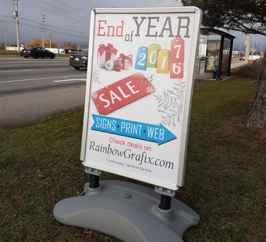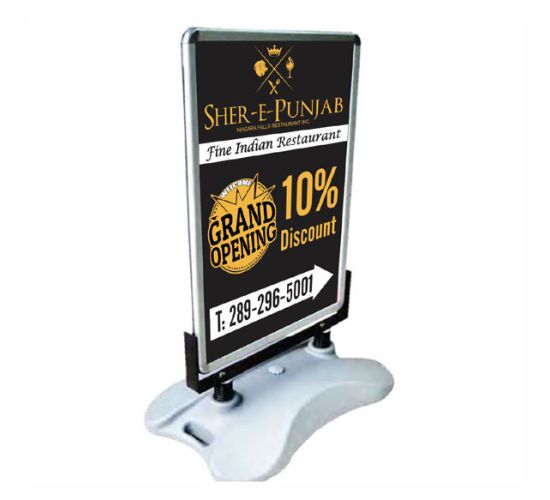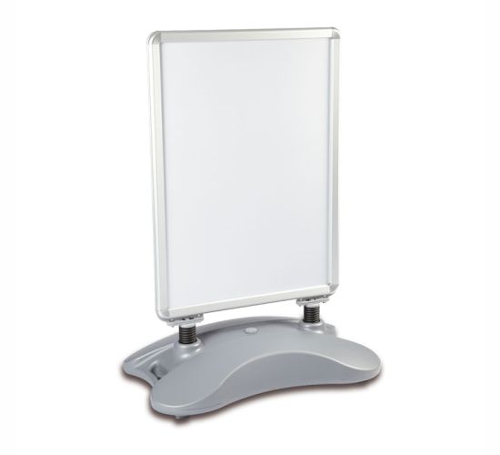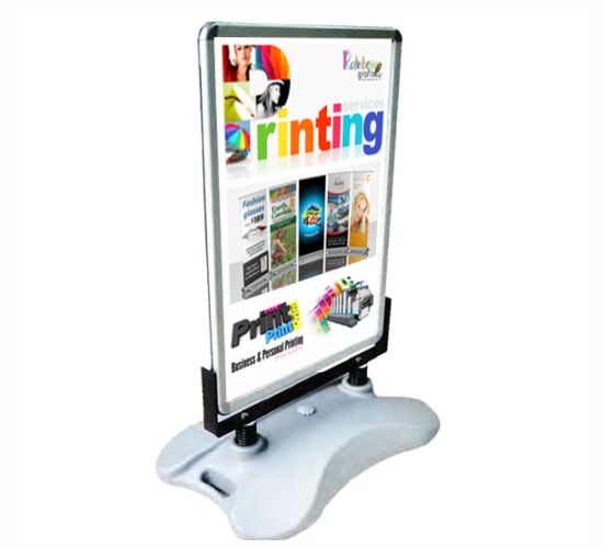 Flexible spring base and wind resistant. Wheels under the base so that it is easier to move around. Double sided aluminum snap frames for easier posters change. Water or sand filled base with carrying handle.